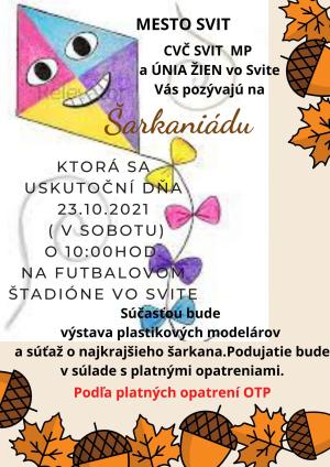 Centrum voľného času vo Svite, Mládežnícky parlament a Únia žien vo Svite pozývajú deti, rodičov a všetkých na „Šarkaniádu“ - v sobotu 23.10.2021 o 10.00h. na futbalový štadión vo Svite.