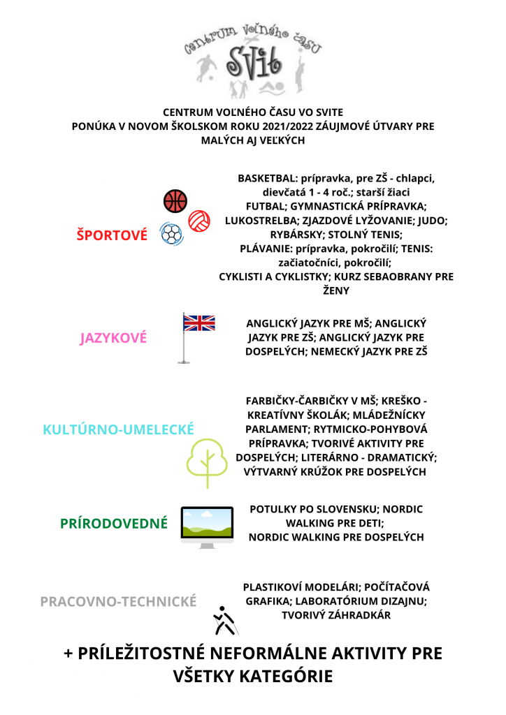 Centrum voľného času vo Svite ponúka možnosť zapojenia sa do záujmových útvarov pre malých aj veľkých v novom školskom roku 2021/2022, ktoré sú zamerané na šport, výuku jazykov, kultúrno - umeleckú oblasť, prírodovednú oblasť a pracovno - technickú oblasť. Info: CVČ 052/7875146.