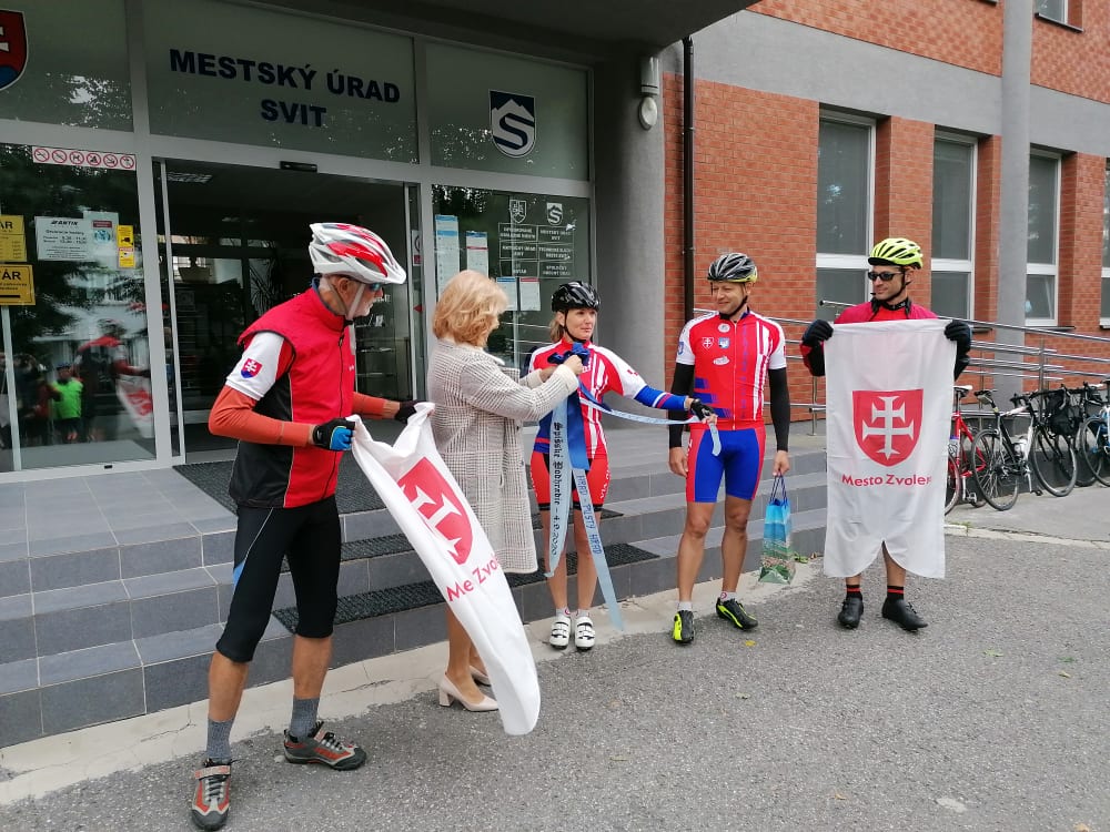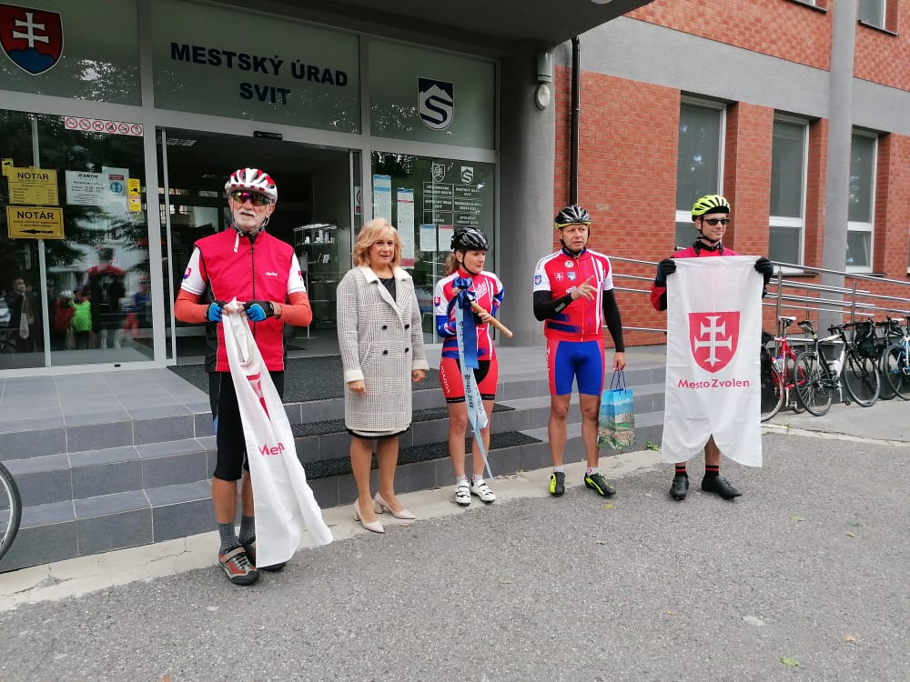 Cyklistov privítala primátorka spolu s prednostom mestského úradu Ing. Jánom Hutníkom pred mestským úradom, kde prebehlo krátke privítanie a pozdravenie s pripnutím stuhy Mesta Svit na pochodeň.