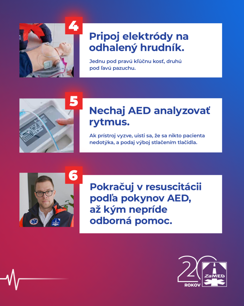 6. Pokračuj v resuscitácii podľa pokynov AED, až kým nepríde odborná pomoc!