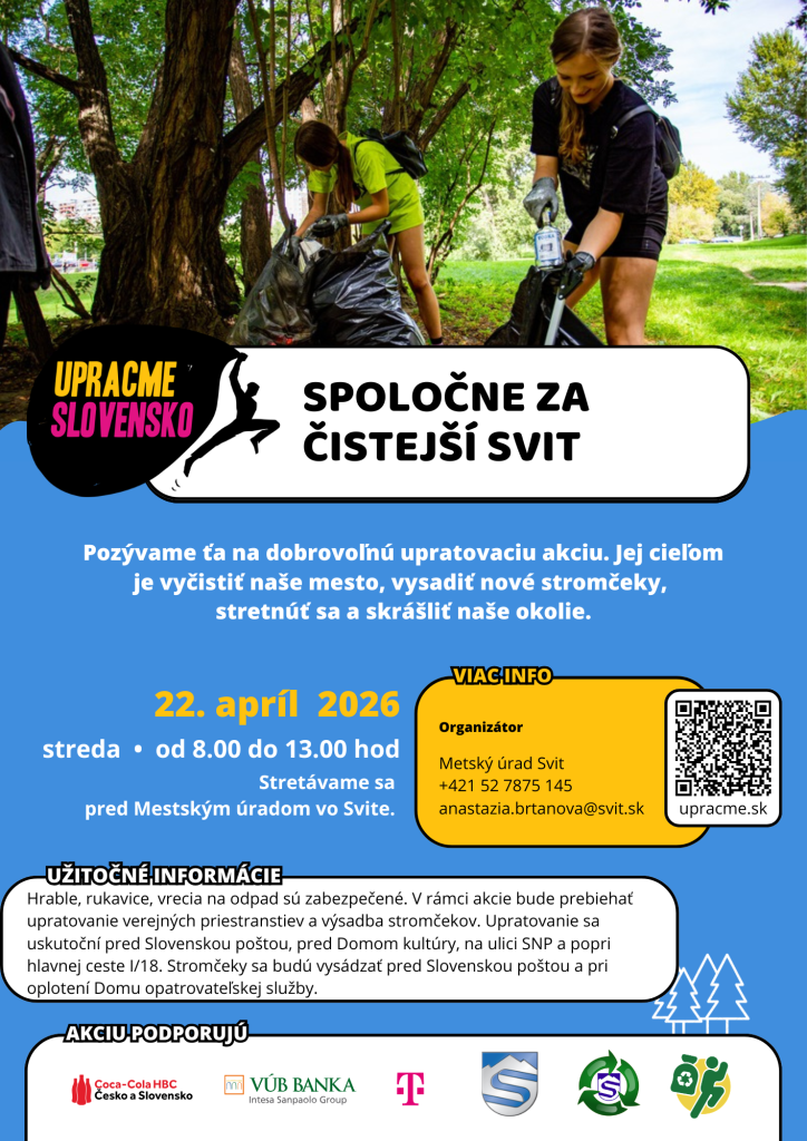 Mesto Svit sa 22. apríla – na Deň Zeme zapája do celoslovenského projektu Upracme Slovensko Pridajte sa k nám a pomôžte skrášliť naše mesto v rámci iniciatívy „Spoločne za čistejší Svit“, ktorú realizujeme v spolupráci s Technickými službami mesta a Smeťozberom.