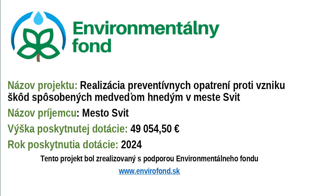 Mesto Svit získalo dotáciu z Environmentálneho fondu v rámci projektu: „Realizácia preventívnych opatrení proti vzniku škôd spôsobených medveďom hnedým v meste Svit“ vo výške 49 054 €. Vďaka tejto dotácii mesto v spolupráci s Technickými službami Mesta Svit vybudovalo 4 kontajnerové stojiská, ktoré majú zabrániť škodám spôsobeným medveďom hnedým.