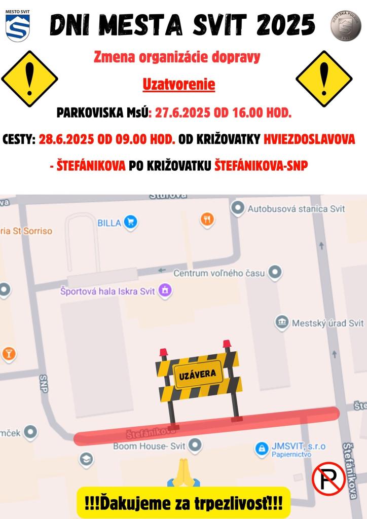 V sobotu 28. 6. 2025 bude z dôvodu konania podujatia Dni mesta uzatvorená aj križovatka Hviezdoslavova - Štefanikova (pri MsÚ) po križovatku Štefánikova-SNP.