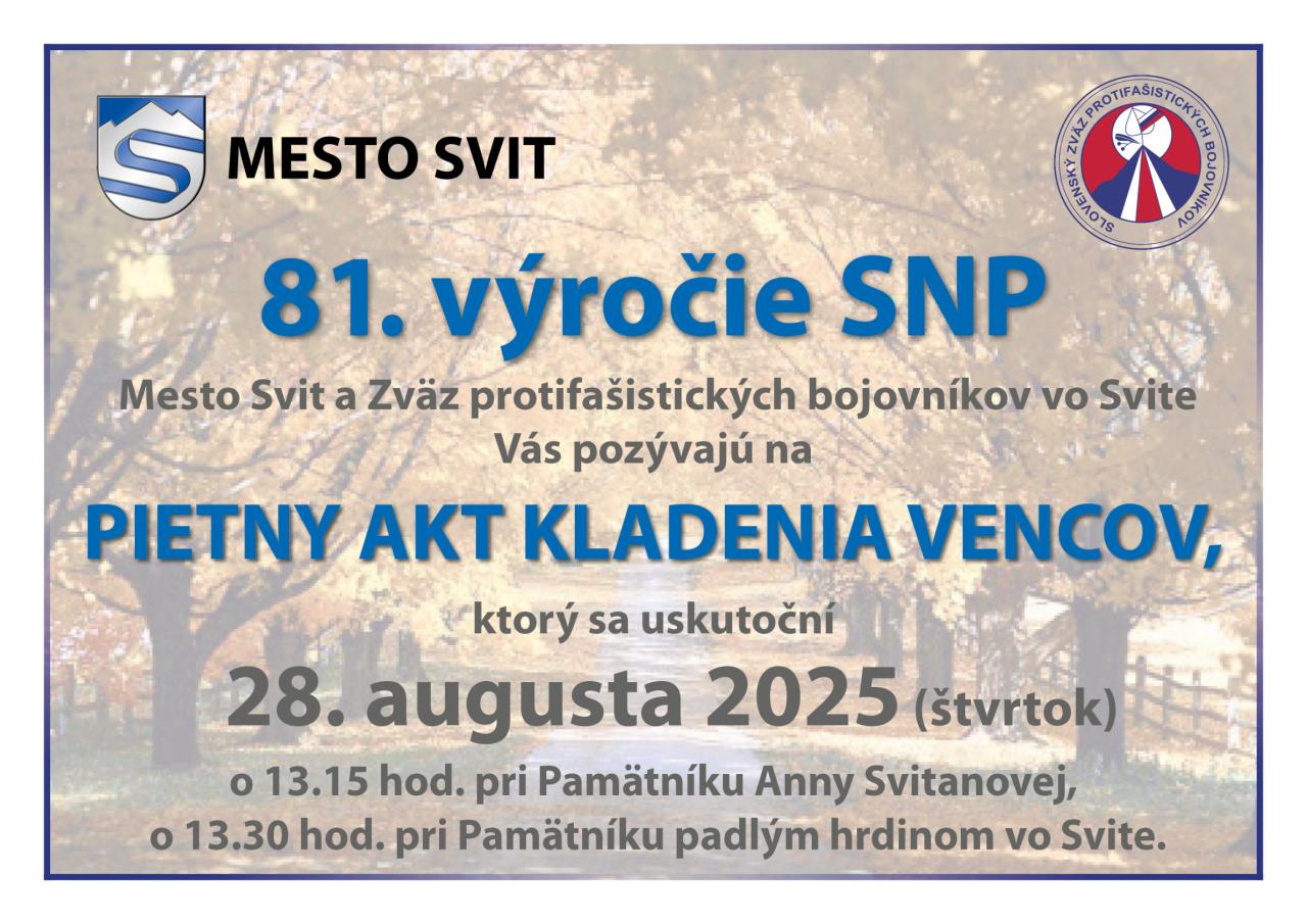 Pri príležitosti 81. výročia SNP - mesto Svit a ZO SZPB Svit Vás pozývajú na spomienkový akt kladenia vencov, ktorý sa bude konať vo štvrtok 28. 8. 2025 o 13.30 hod. pri Pamätníku padlým vo Svite. Kladenie vencov bude spojené s položením spomienkového venca o 13.15 hod. pri pamätníku A. Svitanovej.