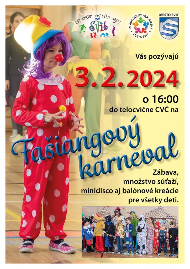 Mesto Svit pozýva všetky deti na fašiangový karneval v sobotu 3. februára od 16:00 hod. v telocvični pri CVČ. Čaká na Vás kopec zábavy, množstvo súťaží, minidisco aj balónové kreácie pre všetky deti.