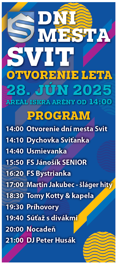 s radosťou vás pozývame na DNI MESTA SVIT, ktoré sa uskutočnia v sobotu 28. júna 2025 od 14:00 hod v areáli Iskra Arény vo Svite.