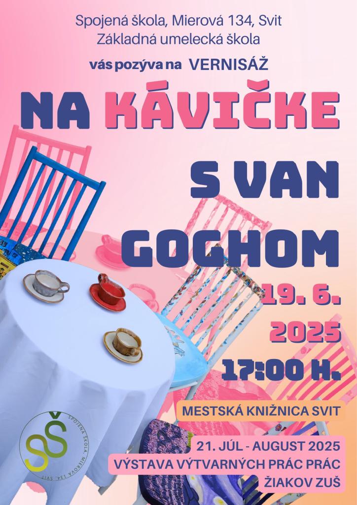 Základná umelecká škola Mierová Vás pozýva na vernisáž "Na kávičke s Van Goghom" do Mestskej knižnice Svit, ktorá sa uskutoční už zajtra 19. 6. 2025 o 17.00 hod.  Všetci ste srdečne vítaní.